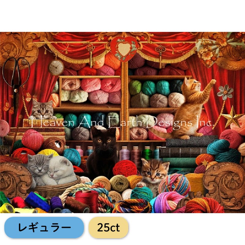毛糸玉に囲まれた可愛い子猫たちの賑やかなシーン。暖かな色合いと細部まで描かれた質感が魅力のHeaven and Earth Designs作品。猫好き・手芸好きにぴったりの一枚です。