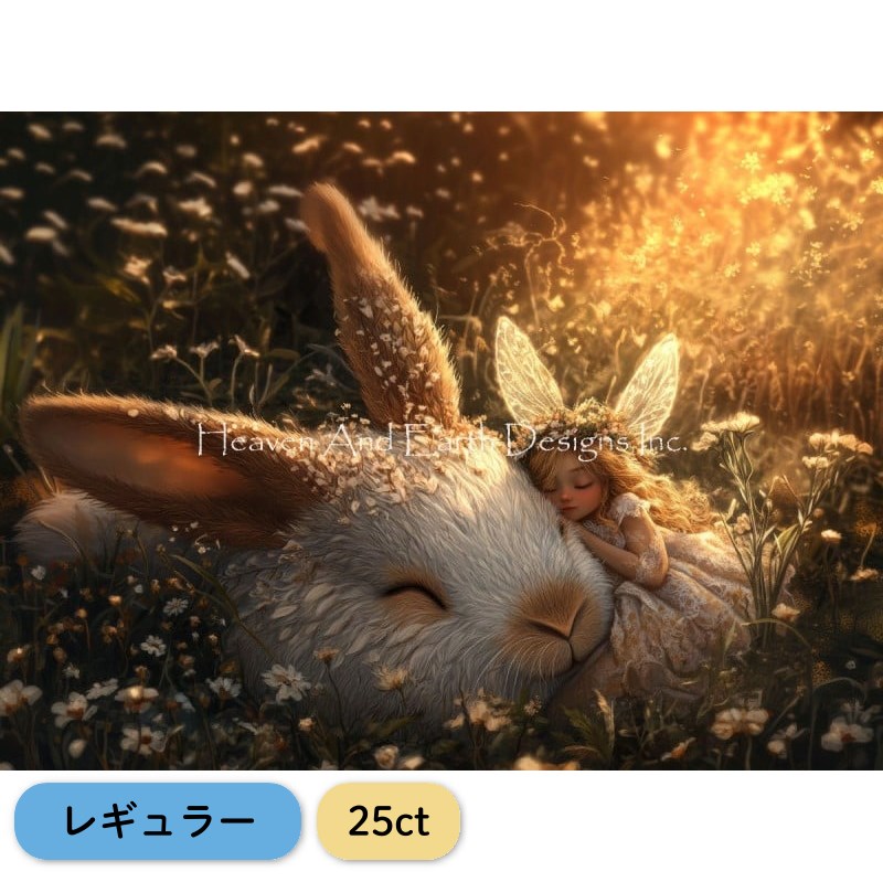 夕暮れの草原で眠るうさぎと妖精のような少女。やわらかな光と幻想的な雰囲気が魅力のHeaven and Earth Designs作品。優しさに満ちた温もりあるデザインです。