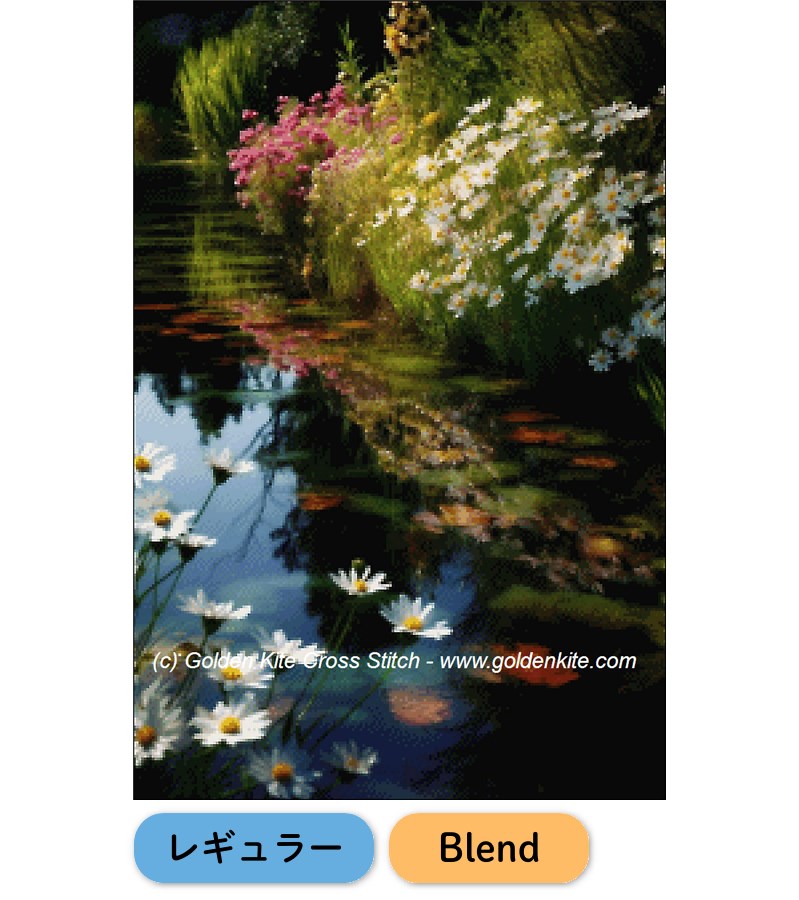 穏やかな小川のほとりに咲く花々を描いた静寂の風景。水面に映る光と色彩の調和が美しいGolden Kiteの人気デザインです。