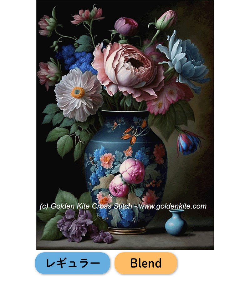 深いブルーの花瓶に咲き誇る花々が描かれた、優美でクラシカルな静物画デザイン。繊細なブレンドカラーが生み出す陰影と質感が魅力のGolden Kite作品です。