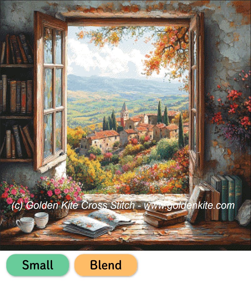 窓辺から眺める丘の町が美しく描かれたGolden Kiteのクロスステッチ図案。温かな陽光と緑あふれる風景が、まるで物語の一場面のように広がります。細やかなブレンド表現が魅力です。