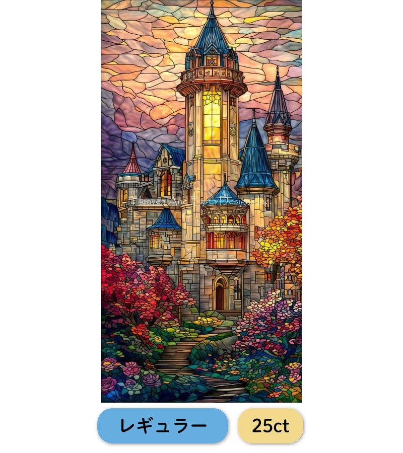 ステンドグラスのような輝きを放つ幻想的なお城が描かれたHeaven and Earth Designsの人気図案。繊細な色彩と光の表現が、まるで夢の世界に迷い込んだような美しさを演出します。