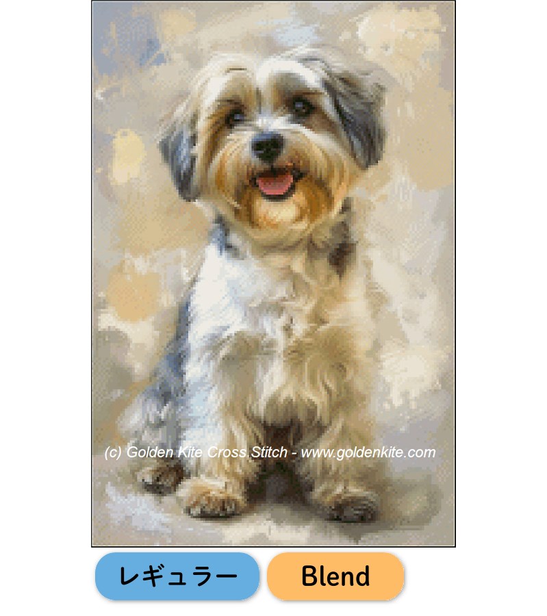 ふわふわの毛並みと優しい表情が魅力の犬を描いたGolden Kiteのクロスステッチ図案。ブレンドステッチによる繊細なグラデーションで、まるで本物のような質感を再現します。