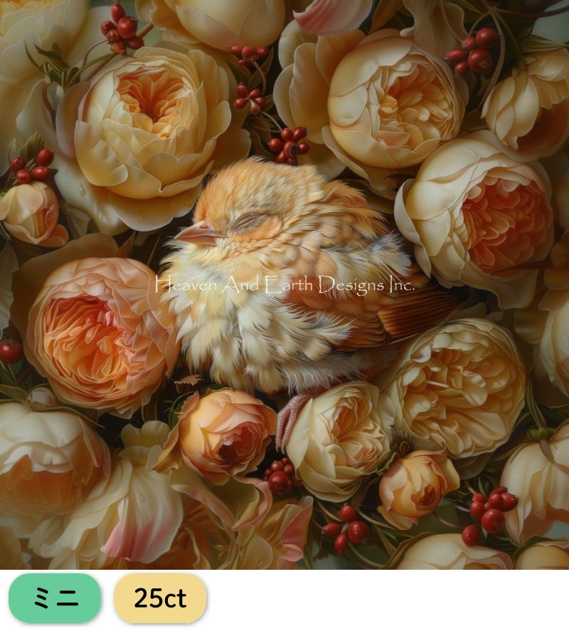 花々に包まれて眠る小鳥を描いた、優美で繊細なデザイン。HAEDのミニサイズながら、羽の質感や花びらの柔らかな色合いまで丁寧に表現されています。