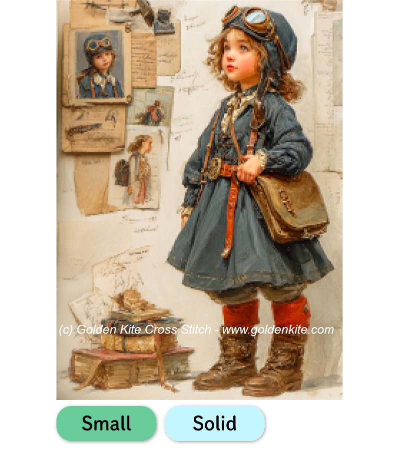 探究心あふれる少女を描いたGolden Kiteのクロスステッチ図案。細やかなタッチで描かれた衣装や小物が美しく、物語を感じさせる温かな一枚です。