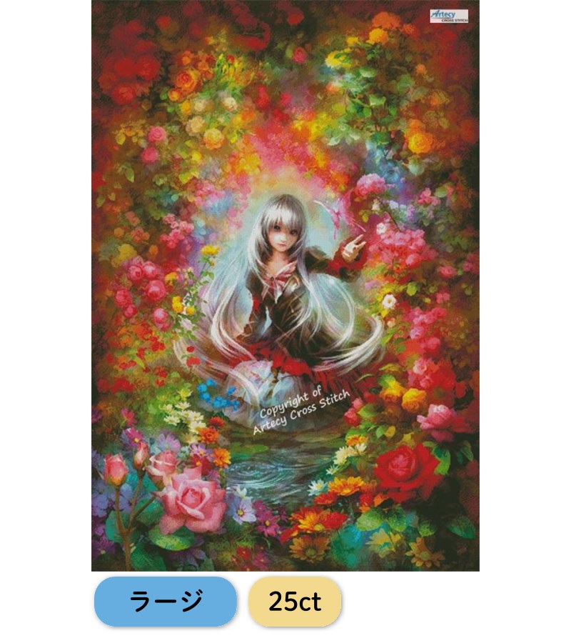 「Arcana Rouge (Large)」は、幻想的な少女と咲き誇る花々を描いたクロスステッチ図案です。鮮やかな色彩とミステリアスな雰囲気で、刺繍の世界を華やかに彩ります。