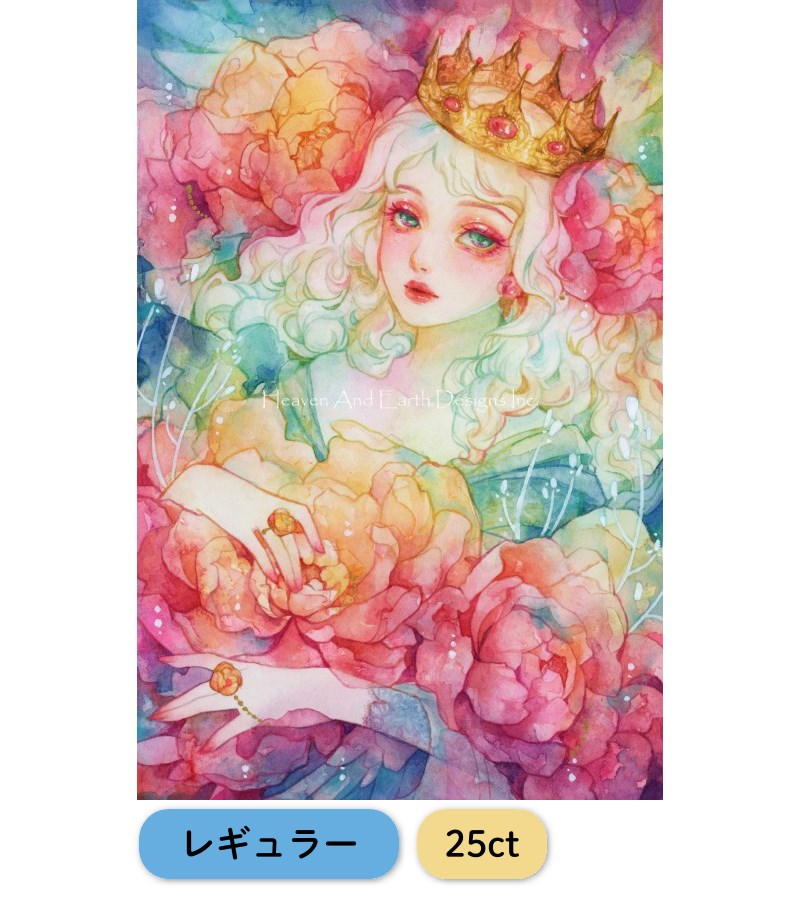 やわらかな水彩タッチで描かれた幻想的な女性と、色とりどりの花々が美しく調和したロマンティックなデザインです。優しい色彩のグラデーションと繊細な表現が特徴で、まるで絵画のような透明感と華やかさを感じられる作品です。王冠を身に着けた可憐な女性の姿が、物語性と優雅さを演出しています。